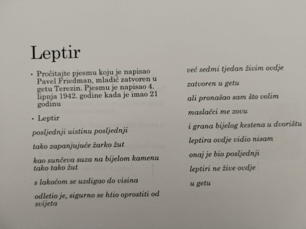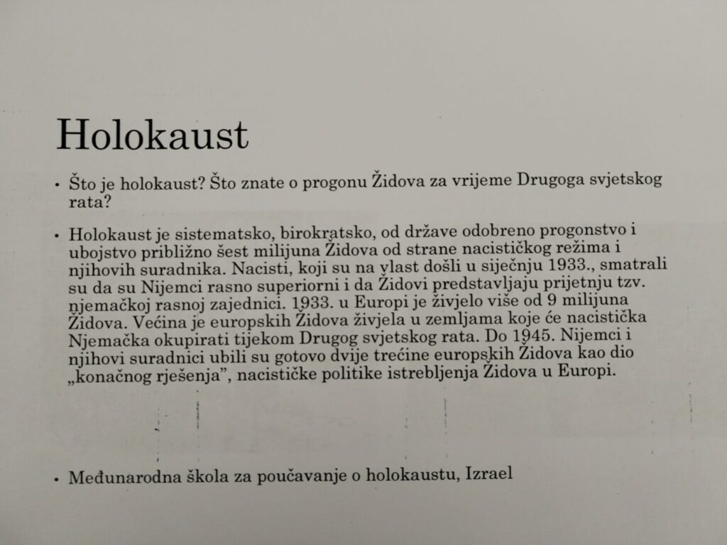 Danas smo obilježili Dan sjećanja na žrtve holokausta, kroz učenje, promišljanje i razgovor o važnosti sjećanja i humanosti. Na satu Hrvatskog jezika učenici su gledali ulomke filma Dnevnik Diane Budisavljević te proučavali poeziju nastalu u vrijeme holokausta, upoznajući snažne i potresne poruke koje govore o patnji, strahu, ali i nadi u najtežim trenucima. Stihovi i filmske scene potaknuli su duboke razgovore o vrijednosti ljudskog života i snazi riječi i umjetnosti. Održana je i radionica o razbijanju predrasuda i stereotipa, tijekom koje su učenici raspravljali o uzrocima društvenih predrasuda te o važnosti poštovanja, tolerancije i prihvaćanja različitosti. Na satovima Povijesti i razrednika učenici su učili o povijesnim okolnostima Drugog svjetskog rata te o razornim posljedicama nacističke ideologije u Europi, kako bismo razumjeli koliko je važno suprotstaviti se mržnji i nepravdi.