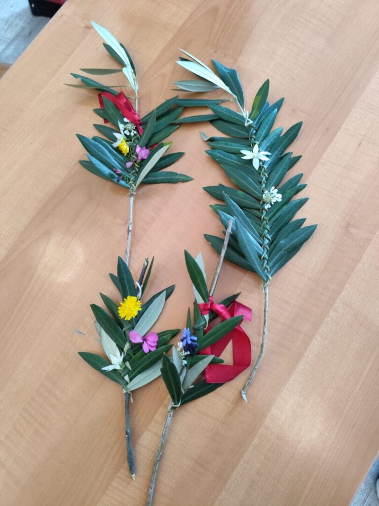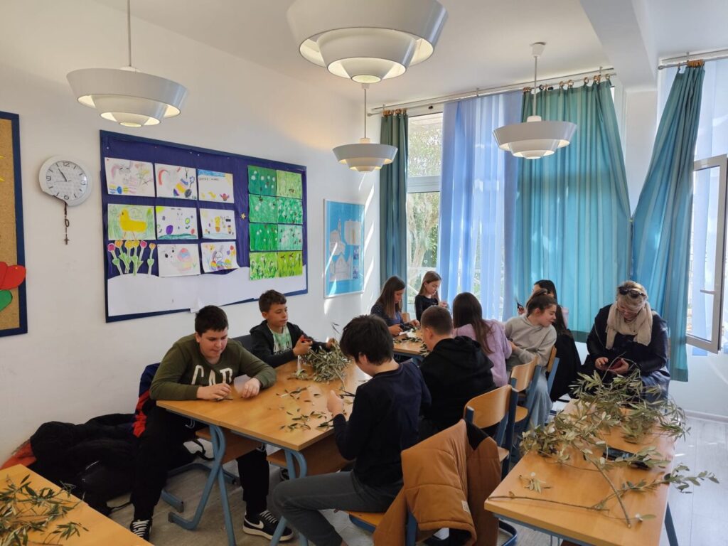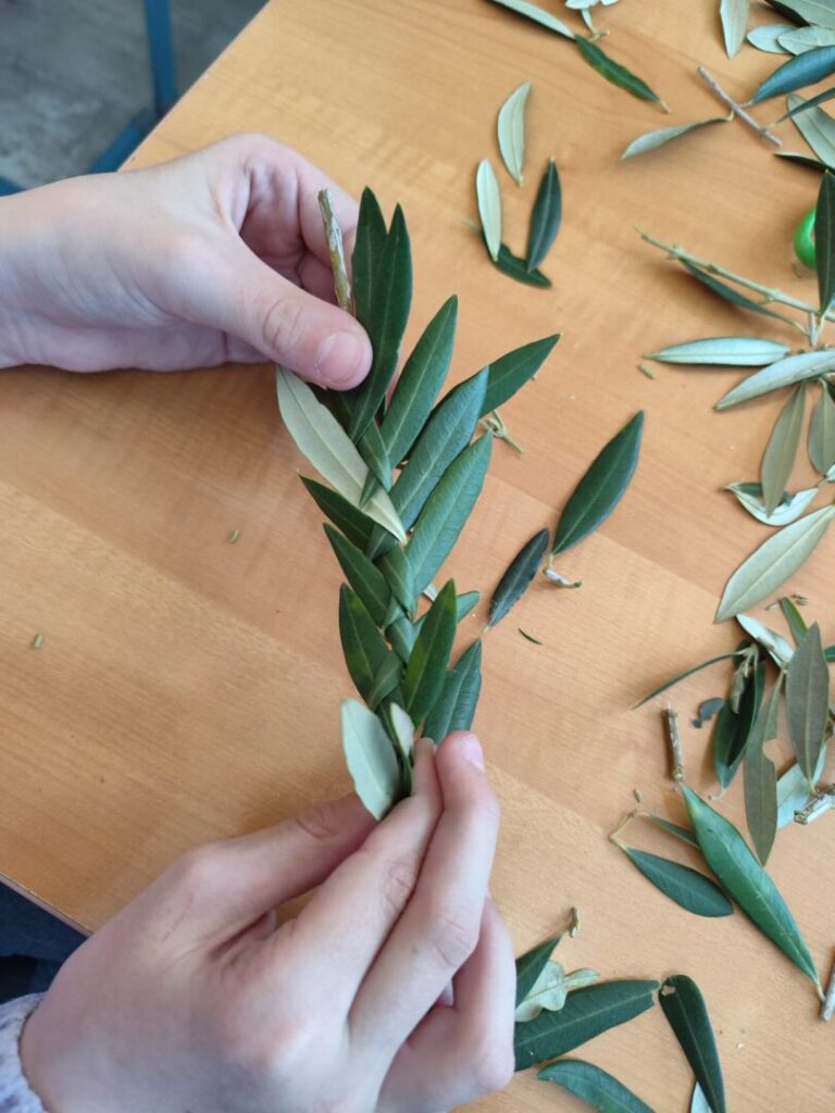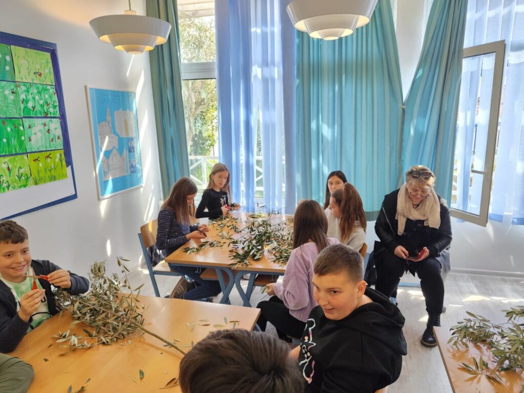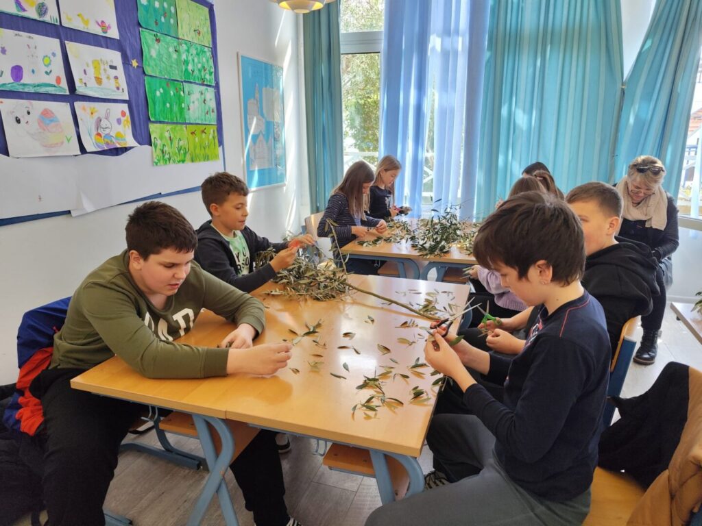 U našoj školi danas je održana kreativna radionica pod nazivom „Pletenje datala“, u organizaciji učiteljice Likovne kulture Branke Ivelje i vjeroučiteljice i voditeljice učeničke zadruge Prizidnica Jadranke Sočo. U radionici su sudjelovali zadrugari – učenici predmetne nastave zajedno sa svojim učiteljima, pokazujući veliku kreativnost, trud i zajedništvo. Pletenje maslinovih grančica jedna je od najljepših priprema za Cvjetnicu, a naši učenici su kroz ovu radionicu naučili vrijedne vještine i njegovali tradiciju.