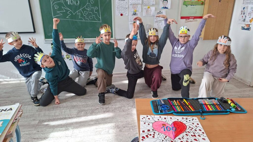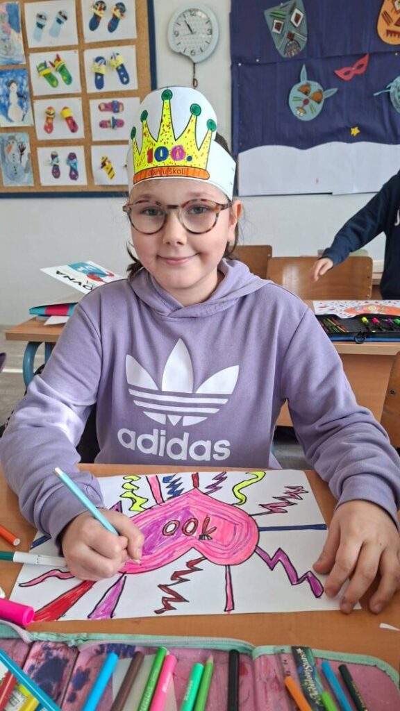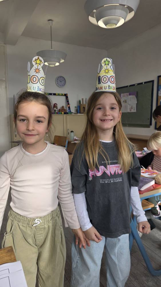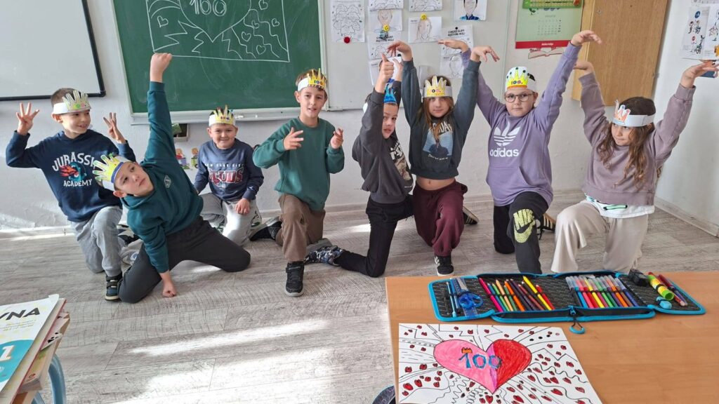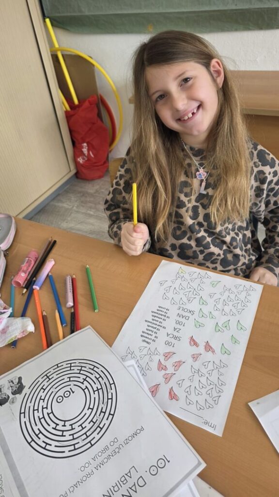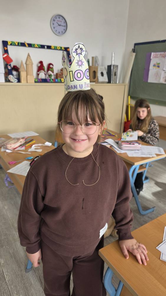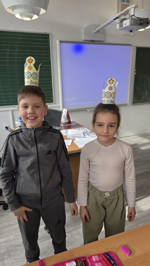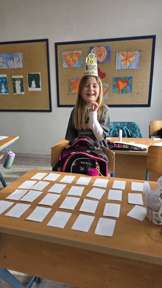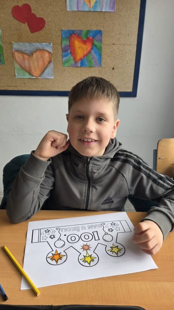 Naši učenici su danas obilježili 100. dan nastave i Valentinovo kroz kreativne i zanimljive radionice ispunjene veseljem, bojama i zajedništvom. Prvaši su s ponosom obilježili svojih prvih 100 dana u školi – obojili su 100 srca, crtali svoj najdraži školski trenutak te pokazali koliko su toga naučili. Vrijedno su riješili 100 zadataka zbrajanja i oduzimanja do 10, igrali memory tražeći riječi i sličice koje u sebi imaju riječ „STO“, izrađivali su krune te zajedno čitali i napisali čak 100 riječi!