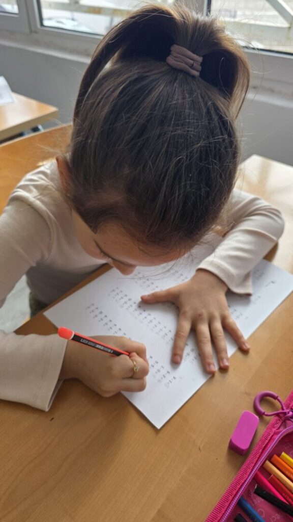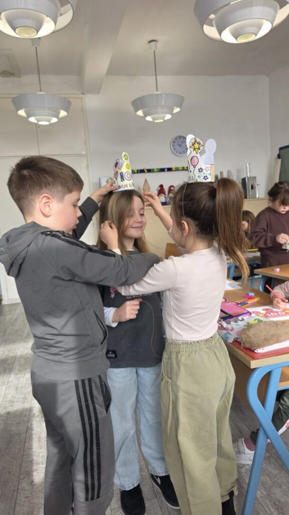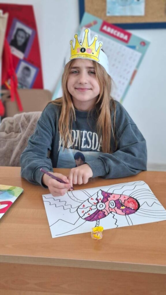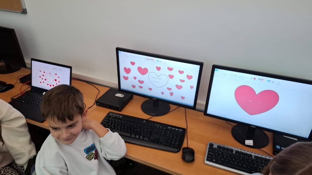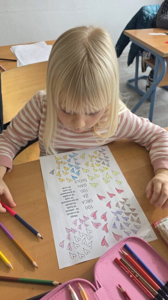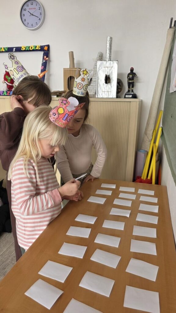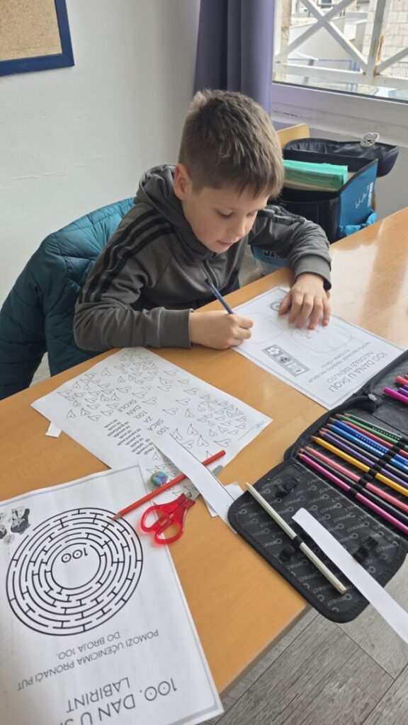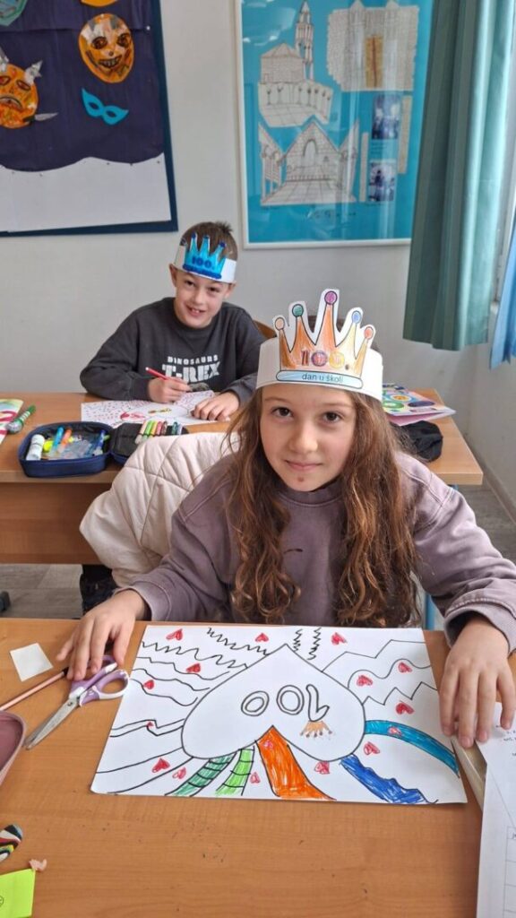 Naši učenici su danas obilježili 100. dan nastave i Valentinovo kroz kreativne i zanimljive radionice ispunjene veseljem, bojama i zajedništvom. Prvaši su s ponosom obilježili svojih prvih 100 dana u školi – obojili su 100 srca, crtali svoj najdraži školski trenutak te pokazali koliko su toga naučili. Vrijedno su riješili 100 zadataka zbrajanja i oduzimanja do 10, igrali memory tražeći riječi i sličice koje u sebi imaju riječ „STO“, izrađivali su krune te zajedno čitali i napisali čak 100 riječi!